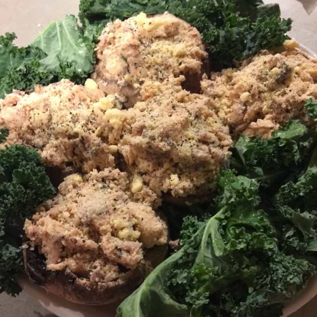We created a side of Kale chips by placing some chopped Kale around the mushrooms and baking alongside (just spray with Extra Virgin Olive Oil Spray and a sprinkle of pink himalayan sea salt) some steamed broccoli and cherry tomatoes.